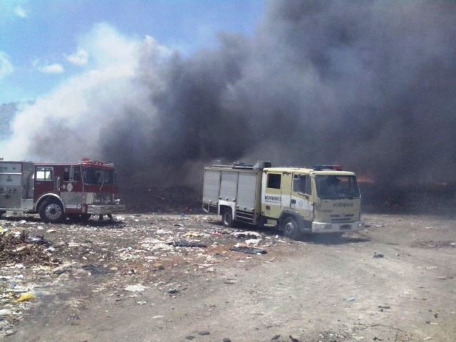 Desde el mediodía de ayer domingo, varias unidades del Cuerpo de Bomberos se encuentran en el lugar tratando de sofocar las llamas de este siniestro presente en el gigantesco depósito de basura a cielo abierto en la misma entrada a esta ciudad turística.